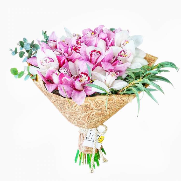 Сочетание таких благородных цветов, как орхидеи белых и розовых оттенков, дополненных неувядающим эвкалиптом, придает букету притягательности и завораживающего очарования. Данная композиция послужит отличным подарком ко дню рождения, 8-Марта, годовщине, юбилею, празднику всех влюбленных или просто так, что бы порадовать близких и родных людей.