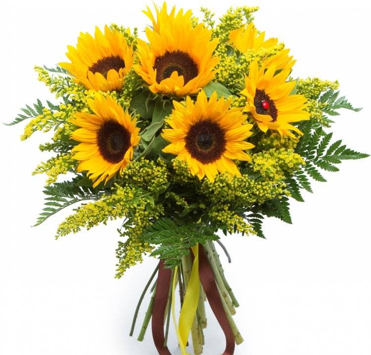 Подчеркнуто страстный букет символизирует любовное пламя. Но не испепеляющее, а благородное и чистое. Подсолнухи как символ жизни, силы и самого Солнца говорят о серьезных и сильных чувствах дарителя. Мягкое и ненавязчивое обрамление из солидаго придает букету своеобразную нежность. Станет отличным презентом для празднования важных семейных событий или хорошим поводом напомнить о своих чувствах в любой другой день.